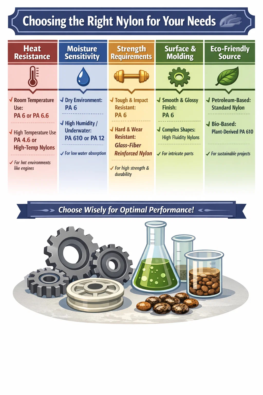 一般家庭または通常の産業用途: 部品が室温または穏やかな環境でのみ動作する場合は、古典的な ポリアミド 6 または PA 6.6 で十分です。コスト効率が高く、日常のほとんどの状況に対応できます。