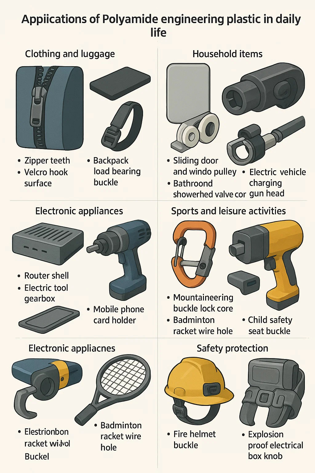 の適用 エンジニアリングプラスチックポリアミド 日常生活では、複数のフィールドが浸透し、そのコア値は、鋼をプラスチックに置き換え、軽量で耐久性があることの特性にあります。特定の典型的なシナリオは次のとおりです。