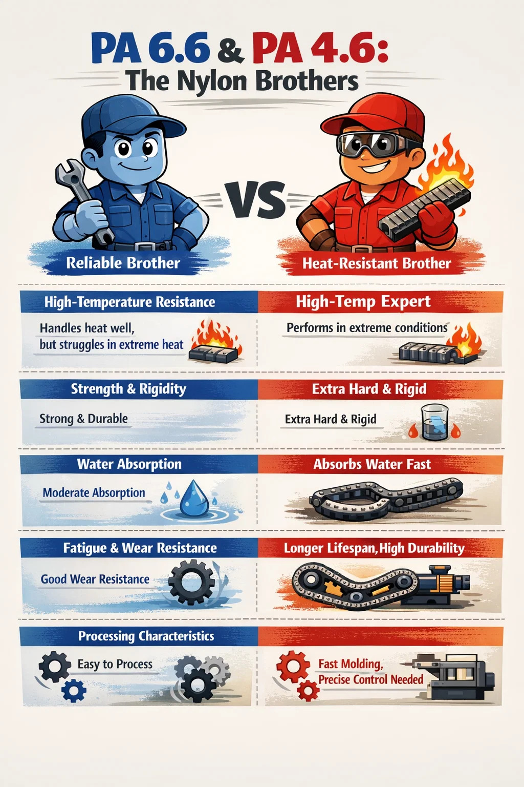 ナイロン ファミリの中で、PA 6.6 と PA 4.6 は 2 つの兄弟のようなもので、外観は似ていますが、異なる個性と機能を備えています。どちらもポリアミドファミリーに属しますが、高温や高応力の用途に対処する場合のパフォーマンスはまったく異なります。