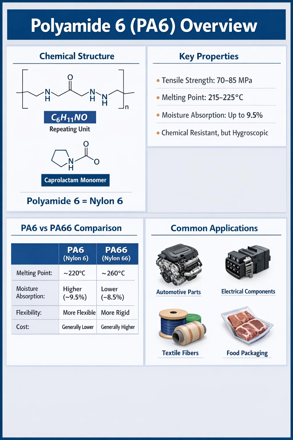 ポリアミド 6 は、世界的に最も多く消費されているエンジニアリング熱可塑性プラスチックの 1 つです。年間生産量を超える 400万トン この材料は、自動車やエレクトロニクスから繊維や食品包装に至るまでの産業に不可欠です。 PA6 が何を意味するのかを理解することは出発点にすぎません。PA6 の化学的性質、性能特性、および処理動作が、PA6 がなぜ商業的にこれほど支配的になったかを定義します。